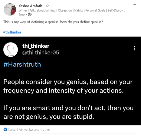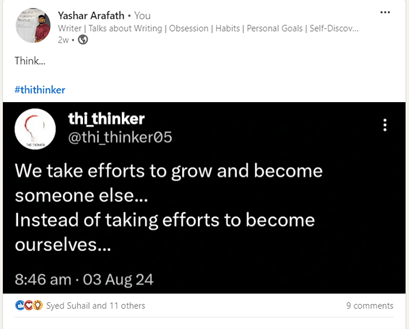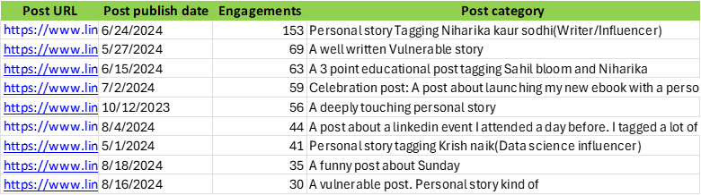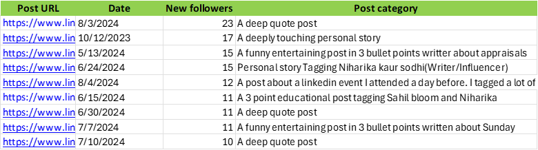 I was listening to a YouTube video of Lara Cousta. She is someone who grew her LinkedIn following from 0 to 50K in a year. I wanted to learn something from her. So I watched her video about growing on LinkedIn. She was explaining the steps for insane growth. One of the things she insisted to do was not just to post. But check your analytics frequently, see what kind of post your audience likes. And double down on the kind of posts that works. I realized I wasn’t doing it. I was simply posting. I hardly checked my analytics and made decisions based on it. So I immediately downloaded my 1 year LinkedIn analytics. And began to dig deep on what kind of posts gave me most impressions, most engagement and followers. The insights what I found blew my mind. Top impressions4 categories of post gave me top impressions. 1. Personal story tagging influencers 2. A deeply moving personal story 3. A funny entertaining 3 liner post. 4. And an educational post tagging influencers. Below is the image for your reference. Top engagementAll the above posts which had top impressions also had top engagements. And one additional category which isn't there above is a celebration post. Top followersI wanted check, in a single day, which posts led me to gain more followers. Not in a week but in a day. I thought my top performing posts would give me more following. It did, but in a span of say a week or couple of days. But in a single day, unexpectedly my deep quote posts gave me more following. Here is an example of my quote posts, So what happened after posting this is, people read this post in an instant. They loved it and followed me immediately. See this below image. Only 2 people liked this post. Just 2. It has zero comments. But it gave me 10 following in a day. I never thought my tweet post would work. Because I post it only on those days when I feel lazy to write. When I had nothing to post. But it worked far better in terms of following. Here are the below categories of posts that led me to top followers My realization:So, 3 things worked for me. 1. Deep quotes 2. Personal stories 3. Personal stories tagging creators. (The creators must like or respond to the post in any way) If you ask me will this work for you as well? I would say no. I am extremely good at one liner, 2 liner deep quotes. You may be good at something else. Use what you are good at, to be unique. Personal stories works well for everyone. Use that as well. Post everyday or frequent enough. See what is working for you. And double down on it. Here is the attached excel file to study my top performing posts. See whether you can use it in your work. Also you can find the links of my top performing posts here. My Linkedin Analytics.xlsx Did you find this letter useful? Let me know by replying this email. To read more such posts: