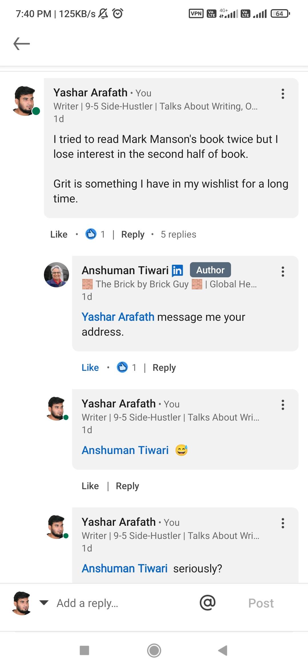 This week’s Thursday was an exhaustive day for me. As I had too many calls. I returned home by 7:30 pm. I went inside my room and saw an amazon package sitting on my chair. I became curious. I opened the package, and I smiled. It was from Anshuman Tiwari. 2 days before I simply commented on one of his posts like I usually do. He recommended to read some books on his post. “GRIT” was one of them. I commented saying “GRIT” is in my wish list. I didn’t buy the book as I felt I didn’t have time to read. He immediately asked my address. I sent him and I forgot about it. 2 days later the courier guy delivered the book to my home. My mom bought and kept it in my room. It was simply a book. But it gave me a moment to taste happiness. We creators engage with other creators in a hope to grow. If not, why do we spend time commenting then? But what was happening through my comments was magical. Here are some surprising incidents happened to me just through comments. Comments – A trust building toolI met Anshuman Tiwai 2 months ago in a LinkedIn creators meet organized by him. He asked my name. I said Yashar. He asked, “Arafath?” That’s my second name. He already knew me because I often comment on his post. I met another creator on the same meet. I recognized her as I would comment on her post. And she recognized me as she would respond to it. She said, I was skeptical to come to this meet as she knew no one here. But when she saw my comment saying I will be coming, she then felt good to come here. Comments lead you to leads.Once a friend messaged me on WhatsApp. He asked some advice regarding job search and cracking interviews. We both were in the same field, which is analytics. He asked for a call. I said yes. Then we connected. During the call he said, he started job search 2 weeks before. Being in a company for 4 years he never searched one. So, he wanted my advice. Then he said, the reason he messaged me and asked for advice was because he read one of my comments where I talked about my job search experience. So, he immediately texted me asking for help. That is when I realized the value of a single comment. It goes beyond growing your audience or engaging with people. Every word you post online, makes an impact to people in a way you never know. So, if you have read this letter till the end. Just go to your social media and drop some valuable comments on other people’s post. You never know how it changes lives. To read more such posts:
